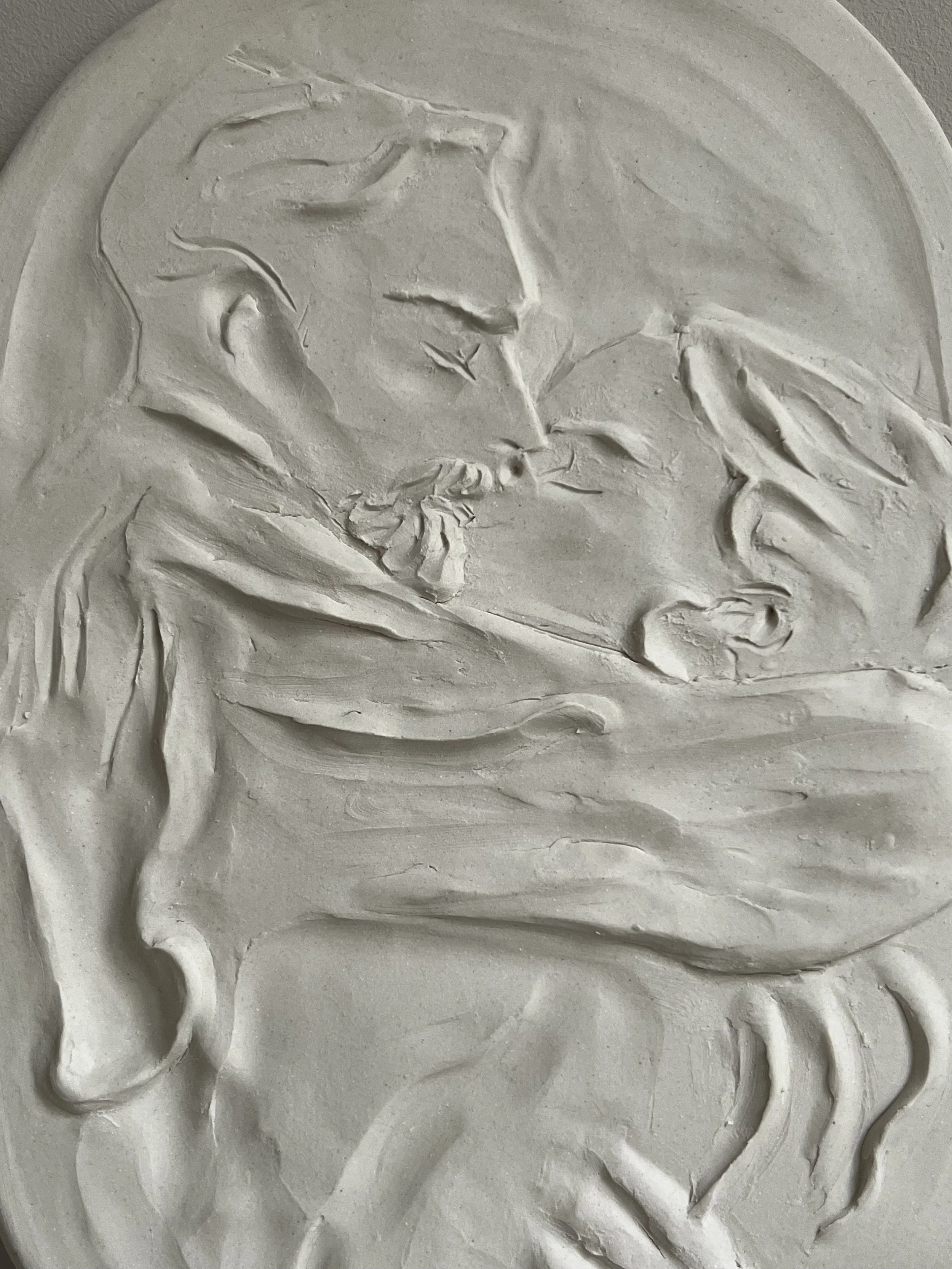 This wall decoration is handmade, therefore it is unique. Made with extra white clay and left unglazed. Has a hanging system in the back.